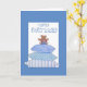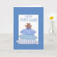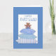 Illustration of a cute little teddy bear seated on a pile of large blue patterned cushions, a perfect birthday card for lovers of bears or toys or cute things!