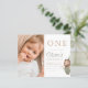 A cute and minimal design, with "one" in classic serif capitals printed at the top of the card. Below, the birthday boy's name is in green script lettering. The party details are aligned to the left, with a hand-painted watercolor teddy bear wearing a party hat, green overalls, and holding a little flag on the right. On the left, there is a photo of the birthday boy. Cards reverse to a cute star pattern against a warm brown background. Ideal for teddy bear picnic, beary first birthday, and woodland themes. As part of Zazzle's budget selection, this sheet doesn't come in standard card sizes. To get this design on a standard card, you can find it in the collection or use the Zazzle Make Machine to transfer it onto your preferred product. View the collection linked on this page for matching items or visit our store for more first birthday party invitations.