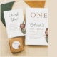 A cute and minimal design, with "one" in classic serif capitals printed at the top of the card. Below, the birthday boy's name is in green script lettering. The party details are aligned to the left, with a hand-painted watercolor teddy bear wearing a party hat, green overalls, and holding a little flag on the right. On the left, there is a photo of the birthday boy. Cards reverse to a cute star pattern against a warm brown background. Ideal for teddy bear picnic, beary first birthday, and woodland themes. View the collection linked on this page for matching items or visit our store for more first birthday party invitations.
