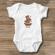 A baby bodysuit with an illustration of a wooden toy: a smiling teddy bear riding a rocking horse in warm tones, and a customisable text, such as forename - a nice gift for a newborn!