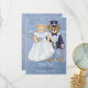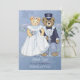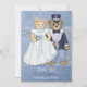 Adorable bride and groom teddy bears. This handsome couple are dressed in their wedding finery. He in his tuxedo and top hat and she is in her wedding gown and veil. Beautiful light blue background has a muted floral motif with lovely detailed floral accent border on front and back. All text on front and back is ready for you to customise.