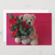 photo of an old teddy bear holds a tree trimmed with red bows says "Come and join us"