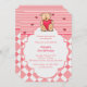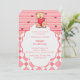 A sweet, sitting, teddy bear is featured holding a heart with little butterflies flying around him. The background has pink and white stripes and a geometric pattern. Want to spend less for this design? Print your cards on the basic, square corner paper. (FP)