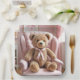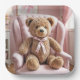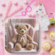 A plush teddy bear with a pink ribbon sits comfortably on a pink upholstered chair in a softly lit room
