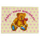 This fuzzy, little bear is an original acrylic wash, on watercolor paper is one of my paintings. The teddy bear art is overlaid on a background of Pink stars. The arched text, 'BABY'S FIRST BIRTHDAY', can be personalized with a child's name, your text or removed. The background color can also be customized.