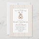 Celebrate the upcoming arrival with this sweet, hand-drawn baby shower invitation featuring soft estate-style stripes forming a vintage-inspired frame. A light beige teddy bear with a delicate bow sits at the top, adding a classic nursery charm to the design. Warm neutral tones, subtle texture, and elegant calligraphy create a timeless look that suits any neutral or traditional baby shower theme.