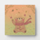 A cute illustration of a teddy bear throwing colorful fall leaves in the air