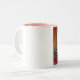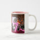 Teddy with Pink hat and Pink Ribbon Mug, sitting in front of Fireplace, Gifts for Breast Cancer Survivors. Photo By the Becks and RJ Kieliger, 12 year survivor.