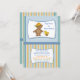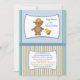 A sporty little bear, with a pull-toy duck, is featured in this adorable baby boy shower invitation. Shades of blue are complimented with colourful pin stripes to create a stylish invitation everyone will love.