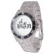 Has heft and feel of expensive stainless steel quartz watches. Good band with safety catch. I removed links, which is easy because engraved arrows show direction to push the linking pins. As always by this seller, the image (a railroad logo) is a perfect reproduction of my emailed image, and is precisely spaced and aligned.
