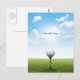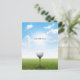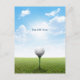 Perfect flat green grass against a blue sky with white clouds and a golf ball teed up ready to be hit with the editable heading reading tee off time.