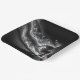 A teenage skateboarder rides down a steep incline trailing a luminous, sparkling aura behind him on black.