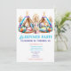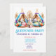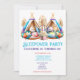 A beautiful watercolor ai graphic featuring two realistic 3D looking boho teepee tents in beige, orange, blue and purple that have straw trees around them and the cutest little cartoon animals sleeping inside them in sleeping bags. A single box of popcorn in a red and white striped box rests on the ground between the two tents and editable pastel coloured text templates appear below the illustration for your custom wording. These are ideal for your son or daughter if they are having a 'boho theme" or a "popcorn and pyjamas" sleepover / slumber party for friends to celebrate her birthday.