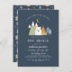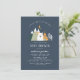 A modern baby shower theme featuring a hand-drawn mountain range, tribal teepee, pine trees, a bear and a crescent moon against a navy blue colour. These cards reverse to a pattern of the elements on the front with added arrows and stars. To customise, edit the text in the template boxes and choose the right printing and paper options for you.