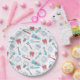 Paper plates with a dental themed pattern. Featuring colourful illustrations of teeth, toothbrushes, and various dental tools.