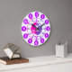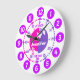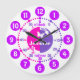 Colourful girls educational graphic wall clock, colour coded to help assist your child to read a clock face. This traditional clock, works as a teaching aid and includes minutes and hours and past to help your child learn to tell the time. Clock is colour coded in pink, purple and white and features a little white butterfly and can be personalised with your own name. Currently reads Jennifer. Designed exclusively by Sarah Trett.