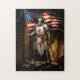 A illustration depicts a Templar knight in full armour, standing proudly with a large American flag draped over his shoulder. The knight is clad in silver armour with a white tunic adorned with red crosses. He holds a long staff with the American flag attached, and his helmet is closed, giving him a stoic and determined expression.