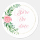 Elegant gold ring watercolor pink floral “Save the Date” sticker. Perfect for envelope seals.