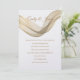 This wedding invitation is shown in a classic layout on a White background shown in a paper choice of Peal Shimmer paper. Select your choice paper. Graphic of Gold sheer veil draped across the top front . Couple's Names mingle with the veil graphic in a Golden-colour at top. Body text shown in Golden-colour beneath the veil drape. Customise this item by taking the sample text and putting your information in it instead.