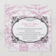 Shown in an ever popular Pearl shimmer, this invite has a Pastel Pink Coronation pattern printed in the background on the front and on the back. A Black Oval with fancy leaf-vine work frames the text inside. Bride and Groom's names are highlighted in a soft Pink and the newlyweds last name in Golden. Body of text shown in Black. Choose your paper choice and customise from their if desired.