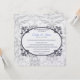 Shown in an ever popular Pearl shimmer, this invite has a Pastel Silver-Grey Coronation pattern printed in the background on the front and on the back. A deep Sapphire Blue Oval with fancy leaf-vine work frames the text inside. Bride and Groom's names are highlighted in a soft Blue and the newlyweds last name in Silver-Grey. Body of text shown in Sapphire Blue. Choose your paper choice and customise from their if desired.
