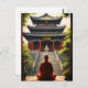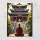 Witness a moment of tranquil reflection as a monk in red robes sits in meditation before a traditional Chinese temple. The detailed artwork showcases the peaceful atmosphere of the scene, with lush greenery and a grand staircase leading to the temple's entrance. A perfect piece for anyone seeking to add a touch of spiritual calm to their surroundings.