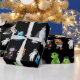 Black wrapping paper featuring all the monsters from the book The Ten Little Monsters Standing in a line.