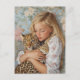 A young blonde girl lovingly embraces a leopard, her eyes closed in a serene moment of trust and connection. The background features a delicate floral pattern, adding to the dreamlike atmosphere.