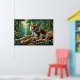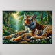 A tiger and its cub share a tender moment in a lush, verdant forest. Sunlight filters through the dense canopy, casting a warm, golden glow over the scene. The adult tiger lies on a bed of soft grass and moss, gently licking its cub, who is nestled close against its mother's side. The cub looks content, adding a touch of innocence to the serene landscape. Surrounding them are vibrant green plants, tall trees, and a small stream, creating a tranquil and harmonious natural environment.