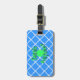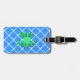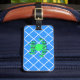 Upbeat design on bright blue background with white net pattern and green tennis ball. Customise text on back.