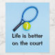 Tennis ball and racket blue background paper plate. Life is better on the court