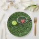 Tennis ball and racket on green background paper plate