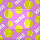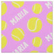 Tennis racquet sport repeat personalised tennis ball pattern sporting design fabric. yellow and white tennis balls on a pink background colour which can be changed if required. Ideal for badminton fans. Customise with your own choice of name, currently reads Maria. Art and designed by Sarah Trett for www.mylittleeden.com