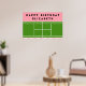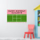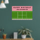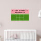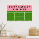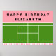 Creative tennis-themed happy birthday poster featuring tennis court on pink background. To personalise edit text to add name or otherwise customise.