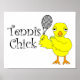 Tennis chick in curly text with a cute chick holding a tennis racket and ball is a funny gift design for tennis instructors and players.