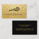 Elegant Black and Gold Faux Foil Business Cards for a Tennis Coach, Instructor, Trainer or Club Manager featuring a modern calligraphy script title and net pattern watermark background with a detailed tennis racket and tennis ball logo design.