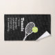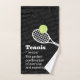 Personalised tennis towel with a simple tennis racket graphic and funny tennis quote definition "Tennis, the perfect combination of exercise and swearing" in black and white and grey with subtle symbol swear words in the background. A perfect tennis themed gift for any tennis player with a foul mouth who could use a sweat towel for their sports bag.
