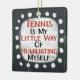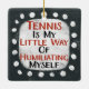 An irreverent typographic design that says "Tennis Is My Little Way Of Humiliating Myself". It features black and red text on a white rectangle with funky, playful white dots surrounding it, all on a dark grey background.