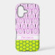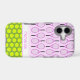 Personalize this pretty iPhone case with a name or other short text. Tennis balls create a bright polka dot pattern, and there is a further pattern of pink tennis rackets on a pale pink background.