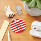 This design features crossed tennis rackets with two tennis balls on a red and white striped background. It is ready for you to personalise with your own caption or a name. The default text is "EAT SLEEP TENNIS". On the back is a simple repeating pattern of tennis rackets on a white background.