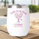 A super fun wine or coffee tumbler featuring crossed tennis racquets, a ball and 3 lines of personalised text. Perfect as a club or tournament award, gift for your tennis friends, a tennis trip memento, drink ware for apres tennis gatherings and just everyday tennis fun! The colour of the racquets and text can be changed easily.