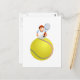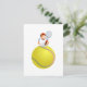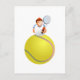 Cute illustration of a happy little tennis player standing ontop of a giant tennis ball with his racket in one hand. Maybe he just plays for fun or maybe he is a professional sportsman. Image available on various gifts and products.