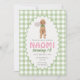 These invitations feature a watercolor portrait of a tan poodle holding a tennis racket for a tennis themed birthday party.