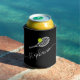 Tennis theme racket and ball monogrammed can cooler name logo in black and white with a feminine elegant calligraphy script handwriting name, perfect for a tennis player, coach, teammate or club instructor.