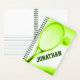 Tennis racket and tennis ball sports green notebook. Customise this book with your own choice of name. Currently reads Jonathan. Ideal for a thank you gift to a tennis coach or player. Designed by Sarah Trett for www.mylittleeden.com on Zazzle.