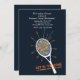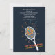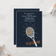 A unisex, adult, sport invitation for a tennis enthusiast's birthday celebration. The black background features a white tennis racquet demonstrating how to maximise the speed of a serve.