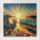 Pretty beach camping themed vintage puzzle with an ai illustration of a tent on a beach as the sun is rising. Ai illustration done in a hyper realistic comic book style art.