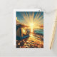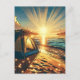Pretty beach camping themed postcard to say hi and keep in touch, with an ai illustration of a tent on a beach as the sun is rising. Ai illustration done in a hyper realistic comic book style art.