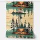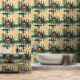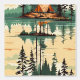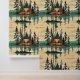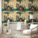 If you are looking to use stick and peel wallpaper in a cabin or camping themed summer house then here ya go. These graphics are forest green and tan vintage colours and are a repeated pattern of tents and pine trees with a reflection in the water.