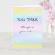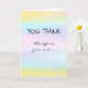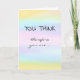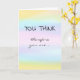 Celebrate a major professional achievement of your colleague, friend, or loved one with this card! The message is a play on the philosopher René Descartes' phrase "Je pense, donc je suis [I think, therefore I am]" ("cogito ergo sum"). The front of the card reads: "YOU THINK," followed by "therefore you are..." Opening the card, the wording continues: "TENURED! Congratulations!" The front of the card has a pastel watercolor wash effect in yellow, light blue, pink, and pale purple. Perfect for anyone upon getting academic tenure!